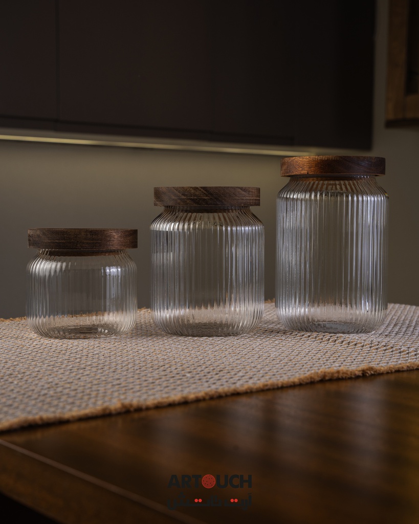 سيت شكردان 3 قطع زجاجي محزز مع اغطية خشبية